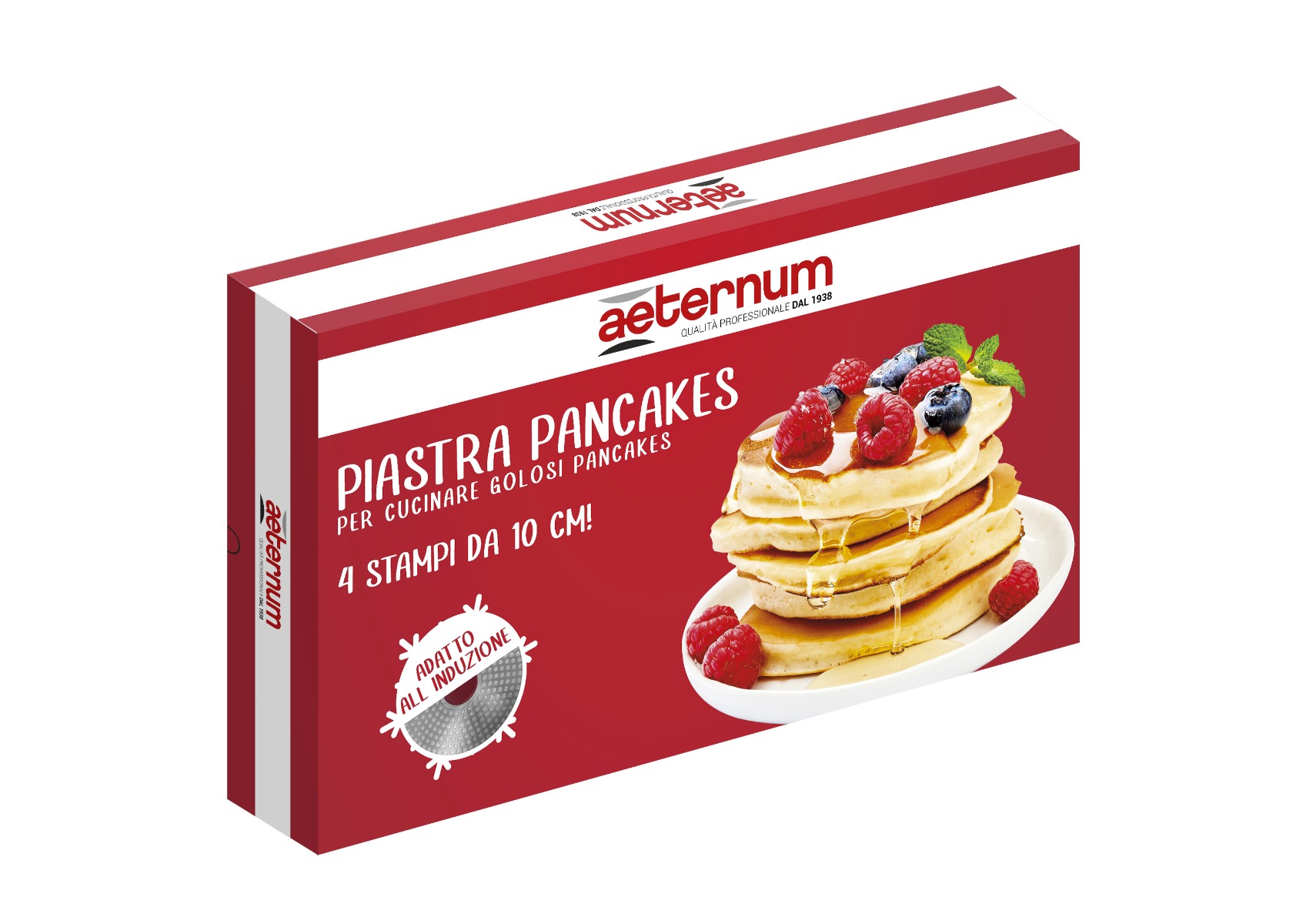 PIASTRA PER PANCAKE diametro 28 cm, con 4 stampi da 10 cm. Corpo in alluminio pressofuso alto spessore. Rivestimento esterno: silicone HT rosso. Rivestimento interno: Petravera Plus 5 strati – PFOA e Nikel Free. Manico in bakelite rosso ergonomico e antiscottatura. Fondo adatto a tutti i tipi di cottura, inclusa induzione. In scatola regalo.