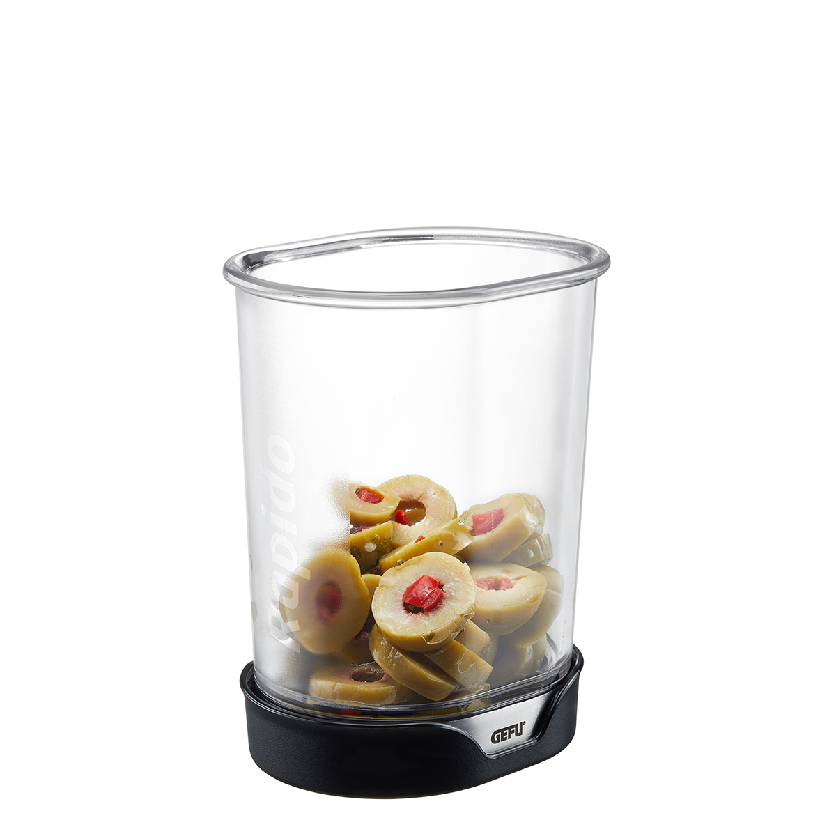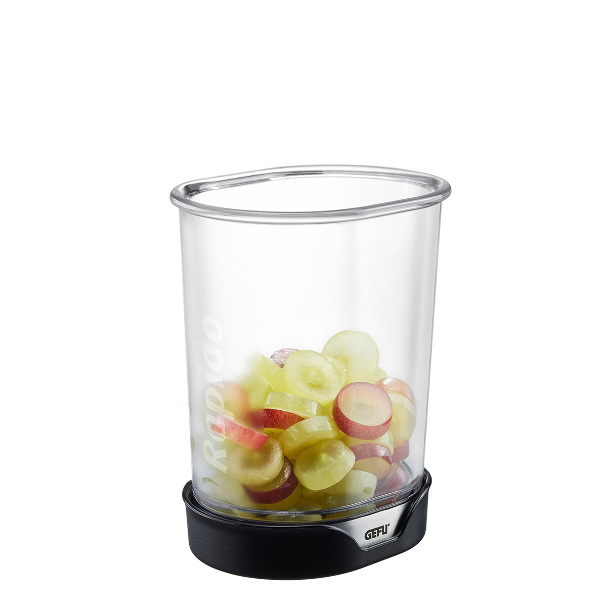 Rapido, più rapido: questa affettatrice consente un utilizzo facile e pulito e produce 4 mm (1/8 in.) -fette spesse di frutta e verdura.§§coltello speciale seghettato in acciaio giapponese§contenitore trasparente dalla forma ergonomica per la raccolta diretta delle fette di frutta e verdura§base del contenitore di serraggio, che funge contemporaneamente da espulsore per gli scarti alimentari intrappolati tra le lame§L 10,3 cm, L 7,7 cm, A 12,0 cm§Lama giapponese in acciaio / plastica§lavastoviglie§Affettatrice RAPIDO Questa affettatrice eroga fette di frutta e verdura tagliate in modo uniforme: è sufficiente posizionare la frutta o la verdura su un tagliere, togliere la base del contenitore e premere il contenitore di raccolta trasparente con le sue lame affilate sopra di esso. Finito! Le fette vengono raccolte nel contenitore di raccolta. Per rimuovere eventuali scarti incastrati tra le lame, basta utilizzare la base del contenitore nero perché funziona contemporaneamente come un eiettore”.”